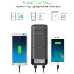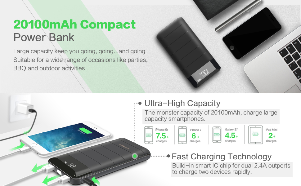 Monster capacity of 20100mAh, charge large capacity smart phones like iPhone 7plus, Samsung galaxy S7 more than 4 times, small capacity phone like iPhone 6s more than 7.5 times. With 10 minutes charging and 1 hour phone talk time, the enough power can keep you going, going…and going