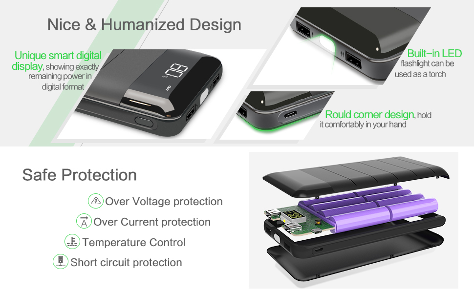 Smart digital screen shows the exact percentage of power; Built-in LED flashlight can be used as a torch; It is FCC, RoHS, CE certified. Surge protection, short circuit protection and more advanced safety protections keep you and your devices safe