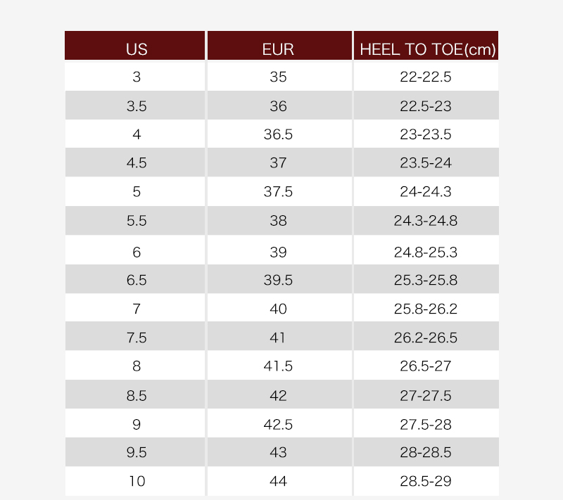 | Shoe Size | US9.5 (EUR43), US9 (EUR42.5), US8.5 (EUR42), US8 (EUR41.5), US7.5 (EUR41), US3 (EUR35), US3.5 (EUR36), US4 (EUR36.5), US4.5 (EUR37), US5 (EUR37.5), US5.5 (EUR38), US6 (EUR39), US6.5 (EUR39.5), US7 (EUR40), US10 (EUR44) |