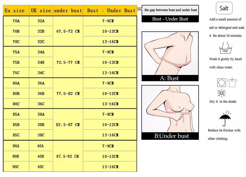 Size: 70,75,80,85,90 (Band: 32.34.36,38,40 Cup: B)