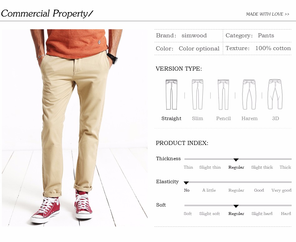 Simwood Brand New Fashion Slim Straight Men Casual Pants 100% Pure Cotton